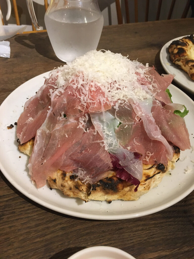 別の日は秋保温泉にあるドットーレというピッツア屋さんへ行きました。このお店も秋保温泉のホテル岩沼屋さん脇の細い道を進んだ狭い住宅地にあり、こんなところに誰が来るの?というばかりの民家(病院?)を改造したような中古の建物でした。しかし店に入ったら満席で、5組目の順番待ちで席が空いたら電話で知らせてくれるという超盛況ぶり。待つこと20分で入店でき、頼んだピッツアは写真にあるルッコラと生ハムモリモリのピッツアです(写真)。自分はイタリアンは好きで、ピッツアもよく食べますがここの生地は過去に食べたおいしいピッツア、ベスト5に入るほどの食感でした。見た目ほど大盛ではなくすんなりいただきましたが、車で行きましたのでビールで食べられなかったのが心残りでした。ここは秋保の山あいですのでセミがガンガン鳴いていてイタリアンの雰囲気はありませんでしたが、意表を突いたおいしさに感動して帰ってきました。ところでセミって夏の暑さに弱いそうです。「えーっ⁉ホンマかいな?矛盾してない?」と思いますが、今年は暑すぎてセミの出生数が少ないそうです。